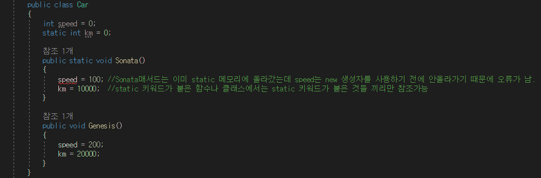 speed = 100; //Sonata매서드는 이미 static 메모리에 올라갔는데 speed는 new 생성자를 사용하기 전에 안올라가기 때문에 오류가 남.