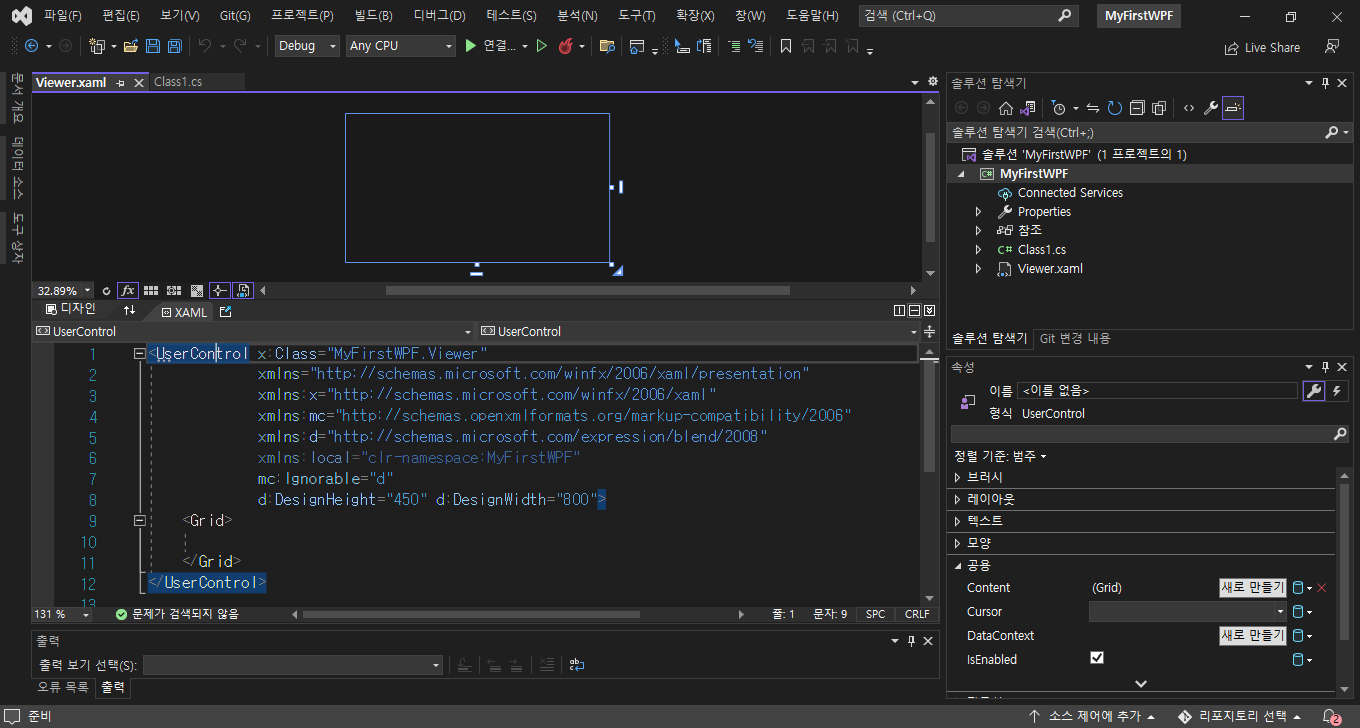 이제 솔루션 탐색기에서 네임스페이스(MyFirstWPF)를 우클릭해서 추가 WPF를 추가합니다.