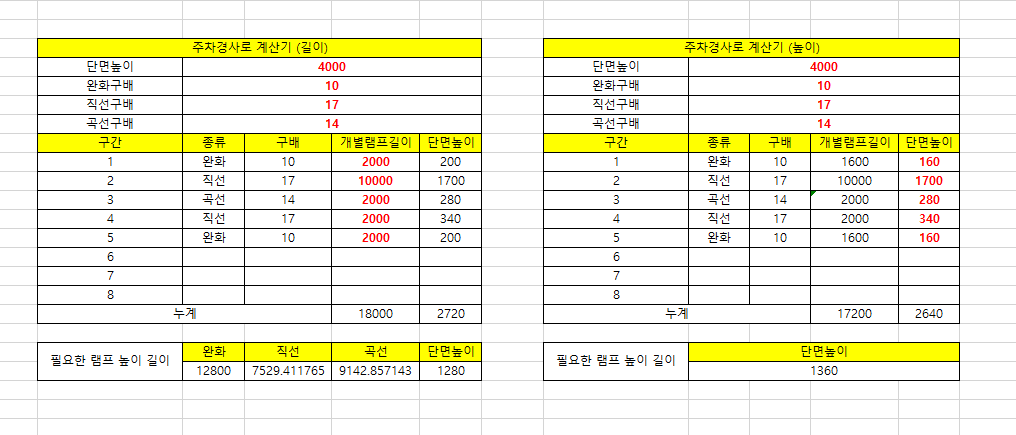 먼저 위 이미지처럼 Excel로 대충 어떤 UI를 만들고 어떤 기능이 필요할지 대략 구상을 했다. 타깃 단면 높이와 구배조건(완화, 직선, 곡선)을 입력하고 길이나 높이값을 입력해가며 조건 충족 여부를 계산하는 방식이다.