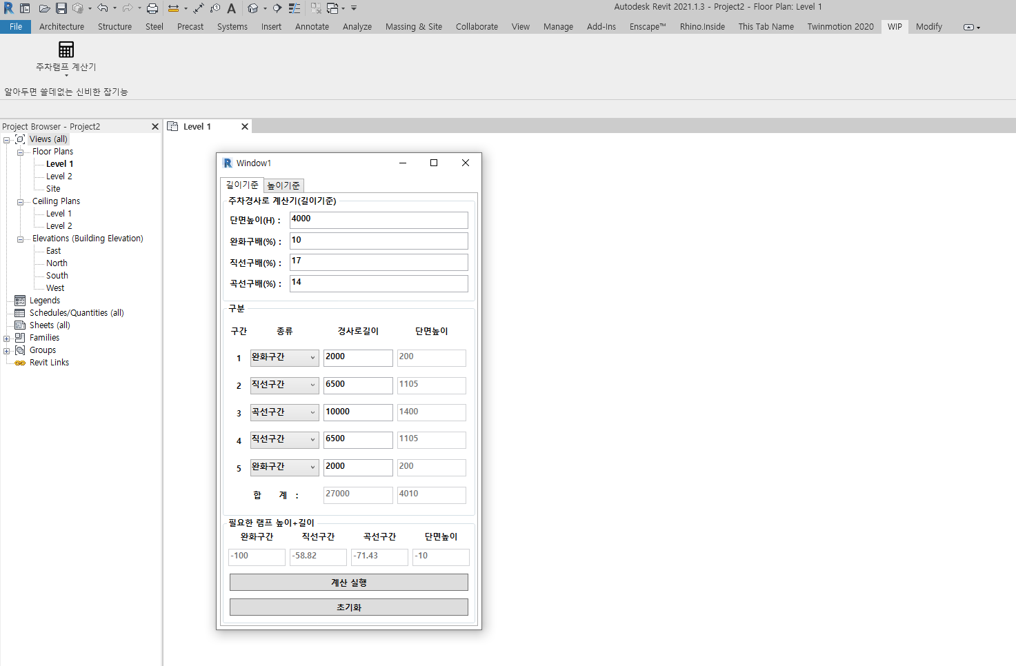 사실 코드를 뜯어보면 많이 지저분하지만 내가 구현하고 싶은 기능들을 시행착오를 거쳐가면서 만들었기 때문에 이해하는데 훨씬 도움이 많이 된 것 같다. 추가적으로 나중에는 주차 경사로 패밀리와 연동해서 패밀리 타입이 생성되는? 기능이 있으면 좋을 것 같다는 생각이 들었는데... 다음에 계산기를 업데이트하게 되면 한번 도전해봐야겠다.